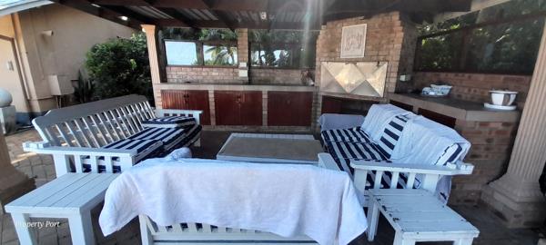 Featuring 4 spacious bedrooms and 3 modern bathrooms, this home provides ample space for family and guests. The open-concept living area is designed for entertaining, seamlessly connecting to a massive bar area that will impress even the most discerning hosts. Step outside to the inviting roofed braai area, perfect for alfresco dining and enjoying the coastal breeze.