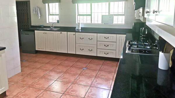 This exceptional property, set on a generous 2208m2 plot of lush, manicured gardens, boasts a spacious and well-designed layout. As you enter through the front door, you are greeted by an inviting entrance hall, with a seamless flow into the living areas. To the left, the expansive living room combines a large lounge and dining area, creating an ideal space for family gatherings and entertaining. This leads into a well-equipped kitchen with ample cupboard space, sleek granite countertops, and a scullery with a laundry, offering functionality and style.