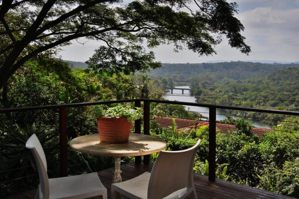 This charming home offers a comfortable bedroom and office or second bedroom with magnificent subtropical views and a well-appointed, modern bathroom . The self contained, one bedroom cottage is conveniently situated close by. Exceptional outdoor amenities include an expansive covered patio and a spacious wooden deck with spectacular river and subtropical views.. These versatile spaces are perfect for alfresco dining, entertaining guests, or simply unwinding while soaking in the magnificent panoramic views of a verdant valley, winding river, and lush sub- tropical vegetation. The generous 1420 sqm erf is adorned with a mature garden, creating a tranquil oasis. Practicality is ensured with a double, motorized garage and four additional parking spaces. There is an outside laundry , ample reserve water storage tanks . solar panels and an inverter.