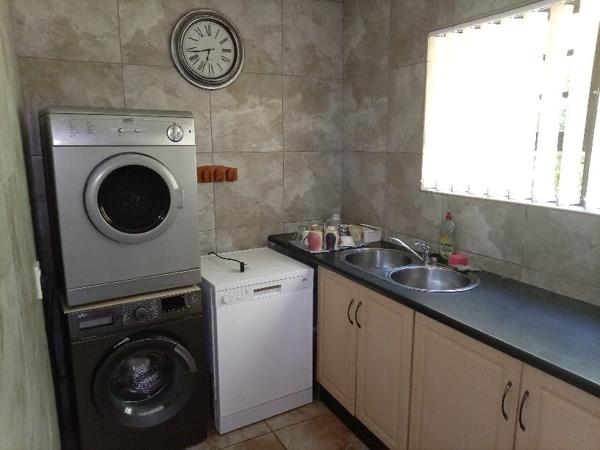 Separate, spacious scullery with additional cupboards and appliance points for washing machine, dryer, and dishwasher