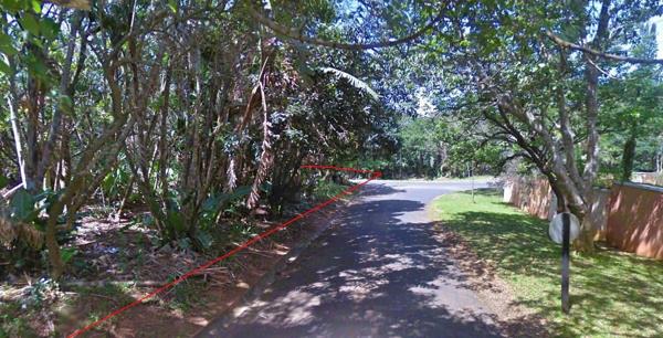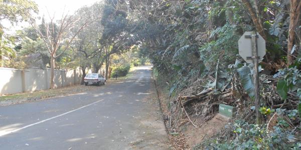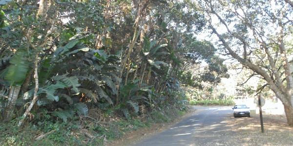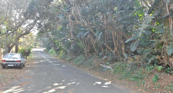 The site features a slight slope upward from the road to the top, with a long side road boundary and a shorter main road boundary. The area is very quiet, as primarily residents use these roads. There are houses situated across the way and behind, along with a vacant stand to the right. The land is covered in natural bush, including trees, banana trees, and scrub. Access is easy, and its a short walk to the town center and the beach. The property is bordered by tarred roads on two sides and has fencing at the back.