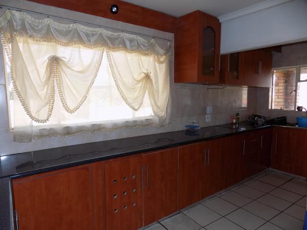 Spacious kitchen, fully tiled, fitted cupboards with oven and hob.