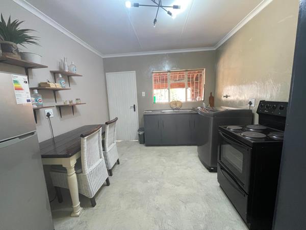 The well-sized kitchen opens onto a small, private patio and garden with ample space for entertaining .