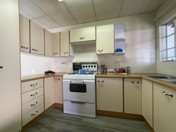 Fitted kitchen with a freestanding stove and access to a enclosed courtyard, ideal for extra appliances.
