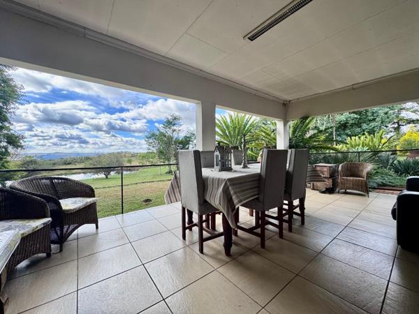 The spacious, fully furnished main house boasts four well-proportioned bedrooms, a formal lounge, dining room, TV/family room, and a well-equipped kitchen. A large, covered patio overlooks a lush, established garden filled with over 500 trees, a private pond, and sweeping views of the distant mountains and valley.