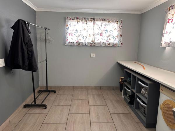 Step into an open and airy living and dining area that has been tiled all the way through that flows seamlessly, perfect for both family gatherings and entertaining. A suitably-sized kitchen, complete with melamine cabinets and a granite center piece, comes complete with an open scullery and laundry, making it a functional yet inviting heart of the home.