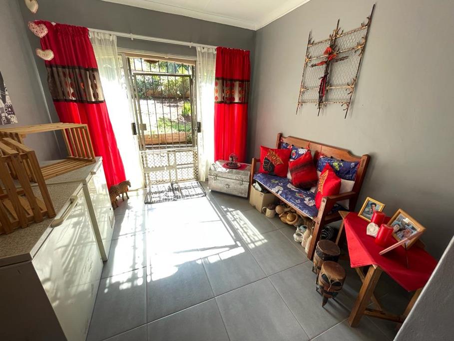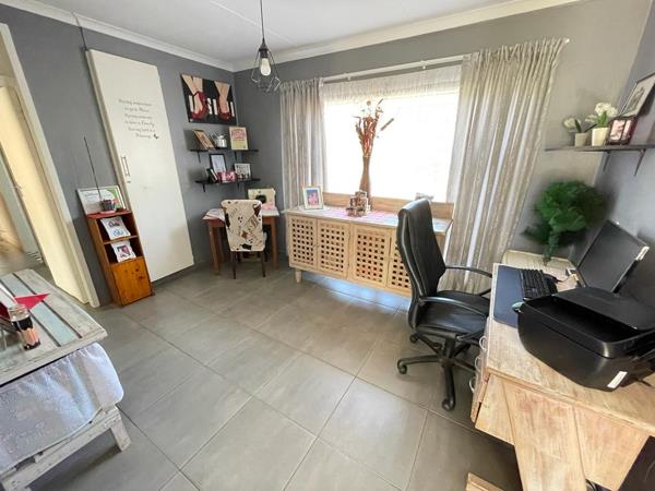 The spacious lounge is tiled out, leading through to the fitted kitchen with enough cupboard and work space.