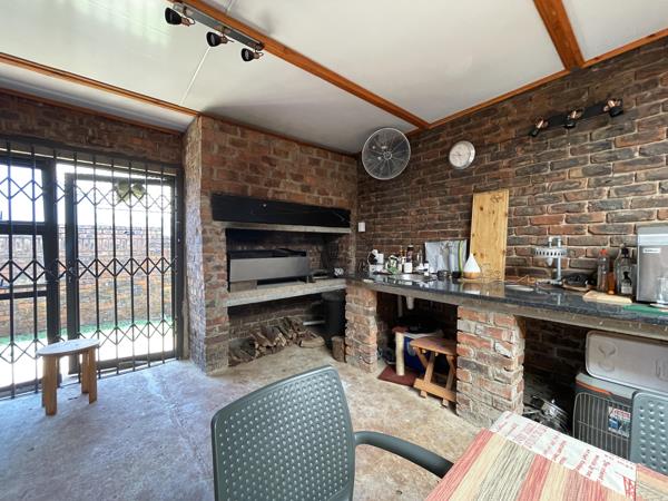 The home welcomes you with a spacious entrance hall leading to a comfortable lounge area. There is also an enclosed entertainment area with a built-in braai, perfect for year-round entertaining. The kitchen is fully fitted and includes a premium Smeg gas/electrical stove.
