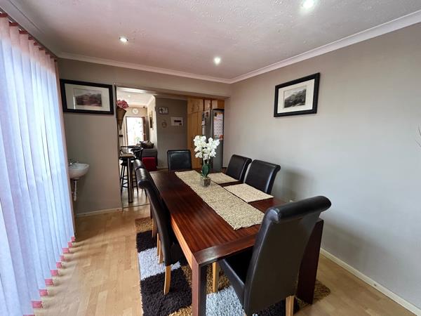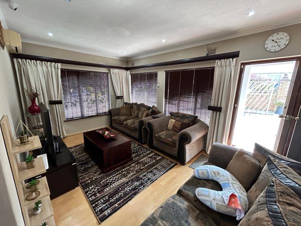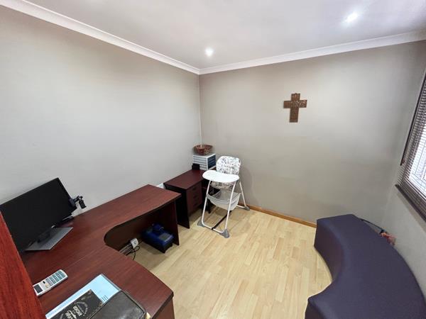 Three bedrooms are situated down the passage, all with BICS and in between them is the main bathroom with shower, basin and toilet as well as a gym which could be changed to a fourth bedroom and can also be utilised as a prayer room. The main bedroom (with en suite bathroom) has an airconditioner as does the lounge.