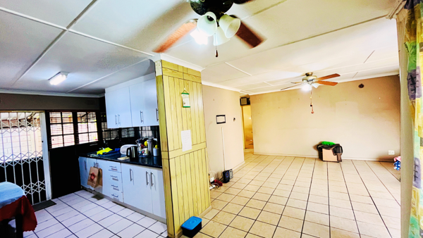 The open-plan lounge and dining area connect seamlessly to a tiled kitchen fitted with built-in cupboards, a wooden counter, a double sink, and a separate entrance for added functionality. Natural light enhances the living spaces, and the tiled floors make for easy upkeep throughout.