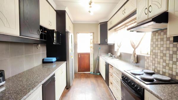Inside, the home features a double lounge that allows for flexible use of space, complemented by warm parquet flooring that adds character throughout. The fitted kitchen is thoughtfully laid out, with ample storage and work surfaces that make it both practical and easy to maintain.