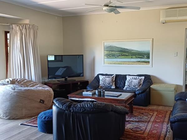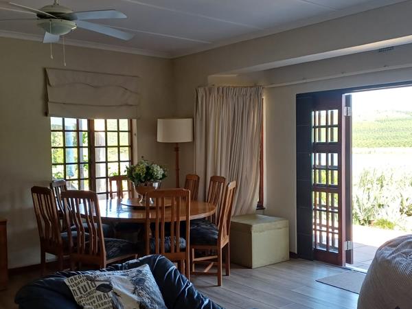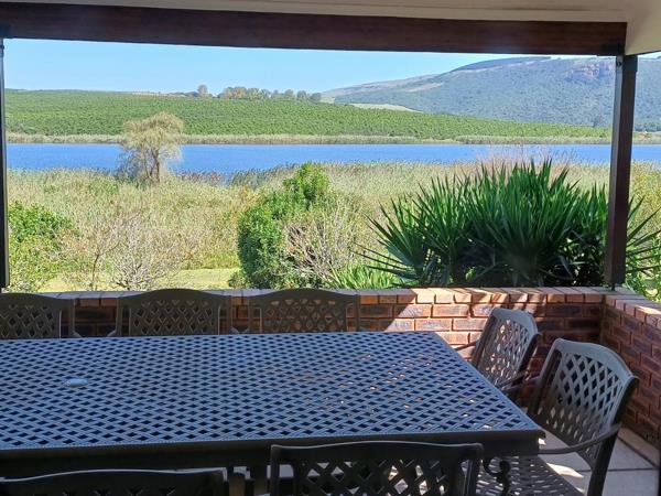 Awake each morning to the beauty of the view of the dam and surrounding farms from your patio. This gorgeous, 292sqm maintenance-free home offers 5 big , airy bedrooms, 4 bathrooms and a guest loo. It is perfect for the fun-loving family or those seeking a weekend escape from the hustle and bustle of city life. The well laid out open plan living areas and kitchen with plenty of counter space and natural light, flow to a comfortable covered patio with glass stack back doors, which lead to a long veranda with access to an open air conversation pit with braai - just the ideal place to watch the stars from and enjoy the sounds of nature. There is a 3 car, tiled floor garage with automated doors. The lovely home boasts an Inverter, Nulu windows throughout, a JoJo tank, Laundry, and cool breezes even on the hottest days plus beautiful birdlife.