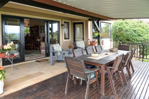 The kitchen is fitted with granite countertops and wooden cabinetry, leading seamlessly into the open-plan dining and lounge area. From here, doors open out onto a beautiful wooden deck perfect for relaxing, enjoying sundowners, and taking in the estates peaceful surroundings.