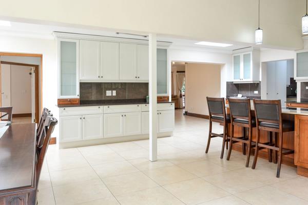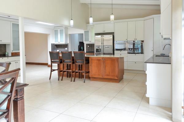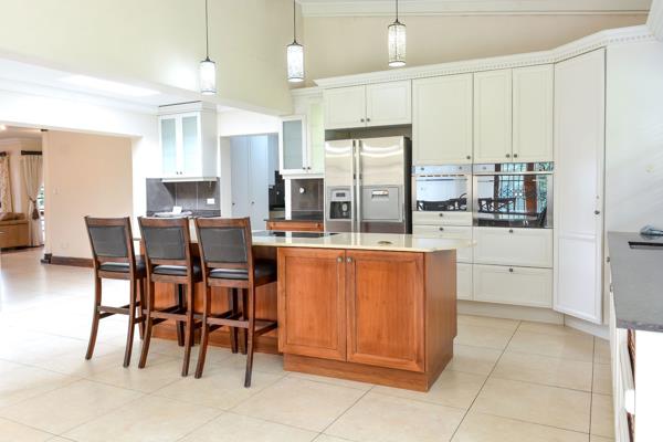 The fully tiled interior ensures easy maintenance, while the modern kitchen boasts top-of-the-range Smeg appliances including an eye-level oven and built-in microwave, ample cabinetry, air-conditioning, and a separate scullery. The open-plan kitchen and dining area feature high ceilings, with double French doors in the dining room opening onto a large, level garden.