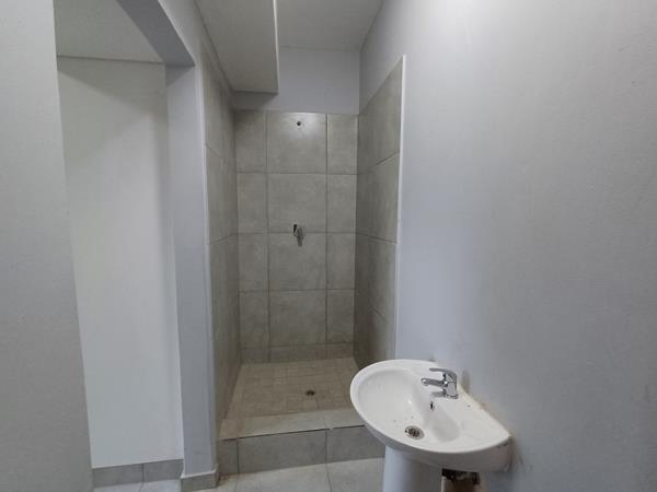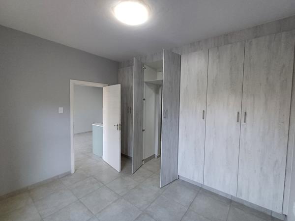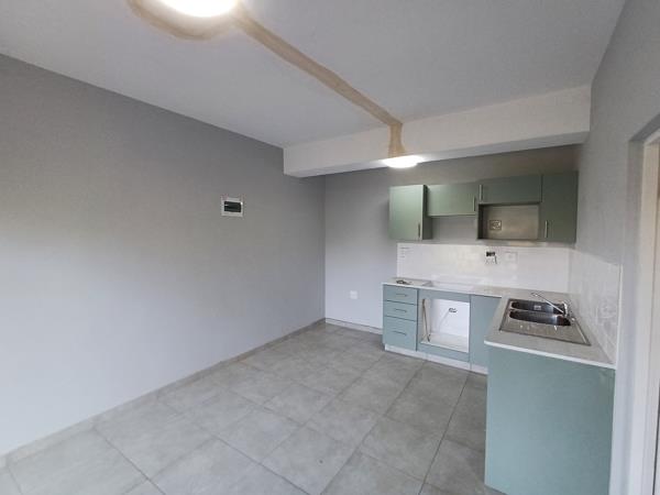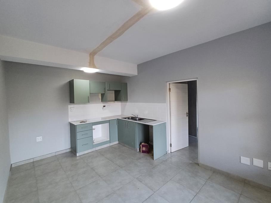 The bedroom has ample cupboard space and an en-suite bathroom with a shower, wash basin, and toilet. The open-plan lounge area flows seamlessly into a modern kitchen, which is equipped with fittings for a washing machine or dishwasher.