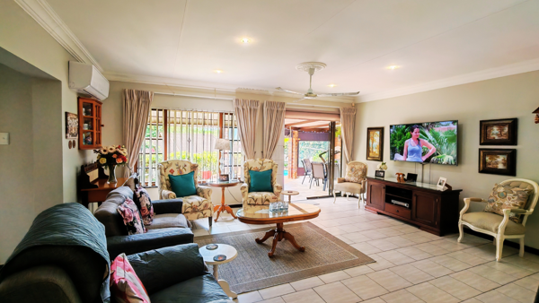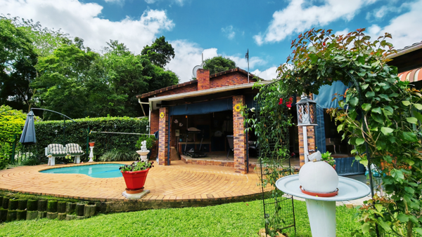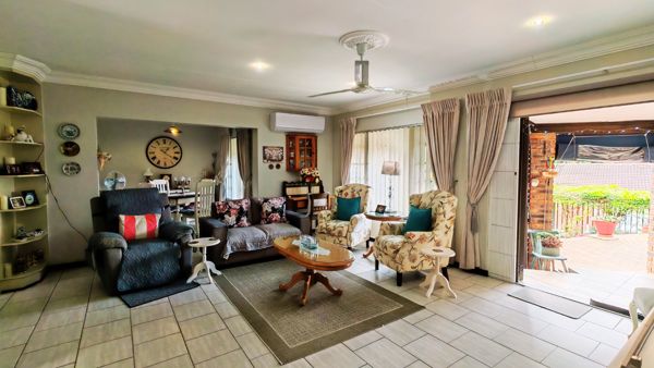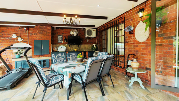 The enclosed patio, complete with a built-in braai, serves as a generous entertainment space overlooking the private swimming pool and manicured garden. Its a versatile area that brings the indoors and outdoors together seamlessly, perfect for enjoying the quiet setting of the property.