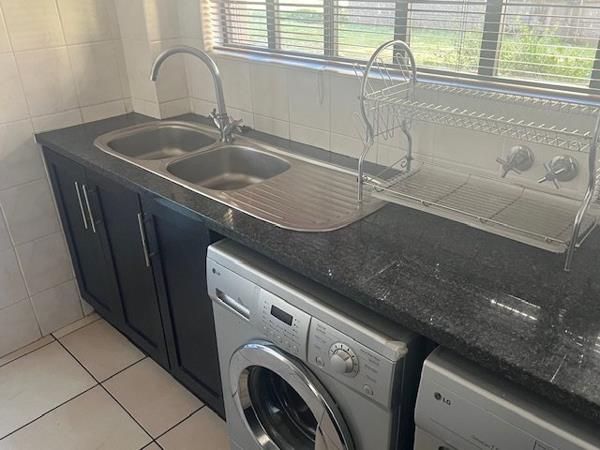 Downstairs is fully tiled and comprises of an entrance hall, guest toilet, lounge opening onto a nice verandah, dining room and an open-plan well appointed kitchen with granite tops and built-in oven and HOB.
