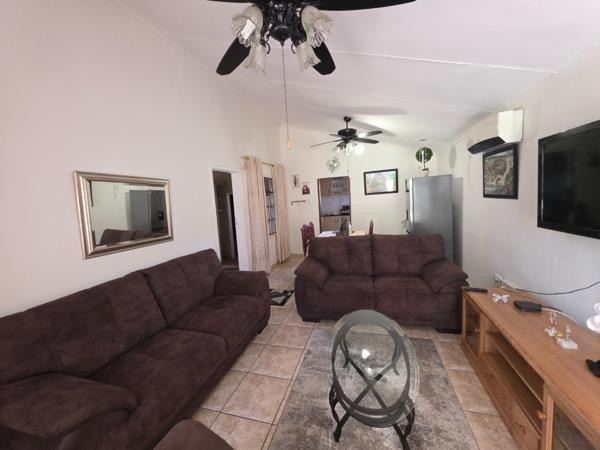 The open-plan Lounge and Dining area effortlessly flows into the fully-fitted Kitchen, complete with elegant granite countertops and space for appliances. A covered awning leads to the washline area, providing a seamless indoor-outdoor lifestyle.