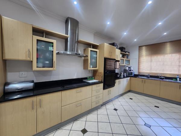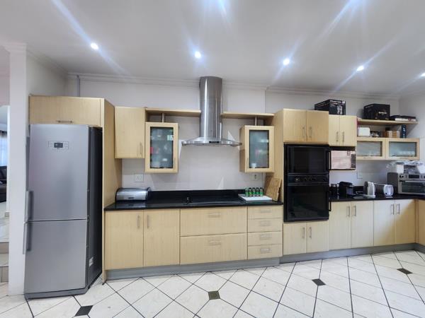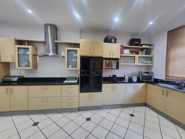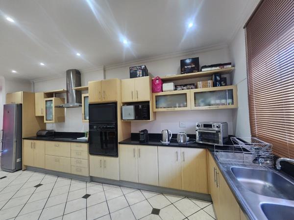 The open-plan kitchen and dining area are spacious and inviting. The kitchen is fully fitted with built-in cupboards, granite countertops, an under-counter oven, and an eye-level oven, ideal for family meals and entertaining.