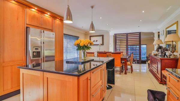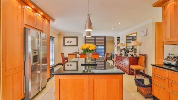 The kitchen flows effortlessly into the open-plan dining area and lounge with a fitted Jetmaster fireplace.