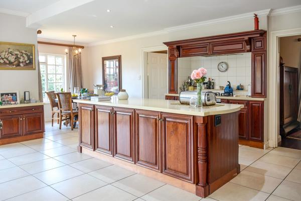 Boasting over 400m² under roof, this gorgeous residence features 4 bedrooms, 2 full bathrooms plus a guest loo, and a spacious open-plan modern kitchen with a separate scullery. The kitchen flows seamlessly into the family room, while the dining and family areas open onto a spacious undercover patio overlooking the magnificent garden, home to more than 300 rose bushes, a tranquil stream, and a picturesque pond.