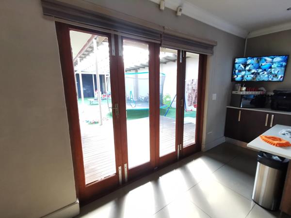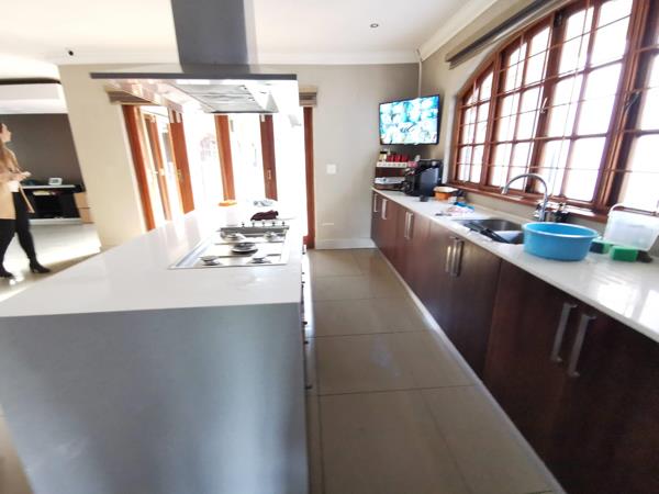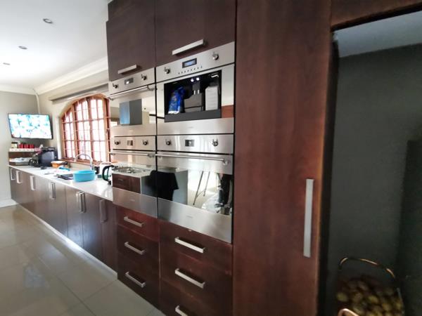 Upon entering through the grand foyer, guests are greeted by polished floors and a sense of spaciousness that flows throughout the home. The kitchen, equipped with a scullery and laundry area, boasts high-end appliances including a built-in oven, hob, and extractor fan, ensuring culinary excellence with a touch of convenience.