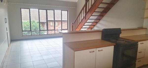 Downstairs is a tiled open plan lounge with fitted kitchen and breakfast bar.