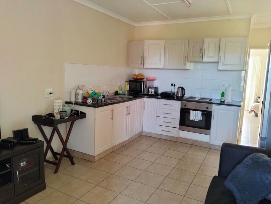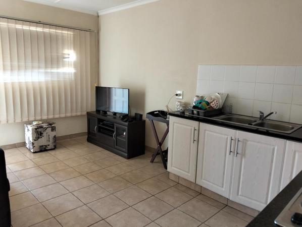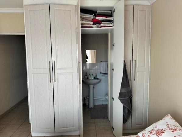 Boasting an open-plan lounge with a contemporary kitchen. The bedroom features built-in cupboards and an ensuite bathroom, while the entire space is elegantly tiled.