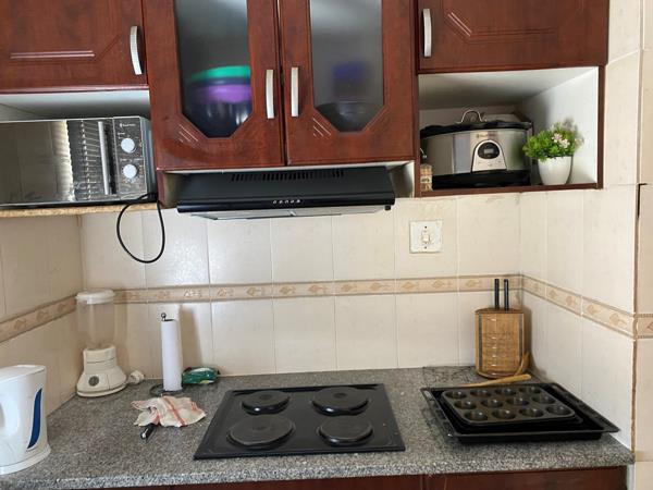 The kitchen has plenty of built-in cupboards and features a built-in oven, hob and hood.