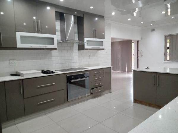 Gourmet Kitchen The heart of the home, boasting newly renovated Pearl Caesar stone countertops, ample cupboard space, a double sink, fittings for a double fridge, a HOB oven and stove, an extractor fan, and a built-in gas stove topperfect for load-shedding days.