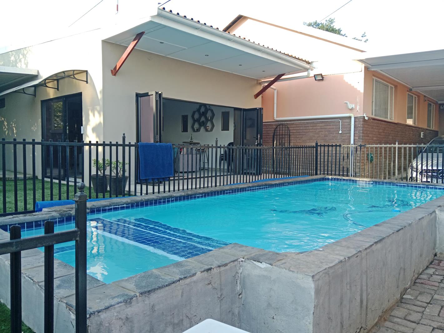 A sparkling swimming pool takes center stage, surrounded by a well-kept, low-maintenance garden with artificial grass and tarred finishes for a neat, easy-care look.