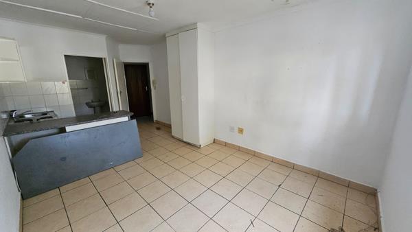 The open plan living room/bedroom and kitchen includes a fitted hob, sink, and cabinets. The bathroom features a shower, toilet, and basin, with space for a washing machine. Enjoy access to a communal pool and an open parking bay.
