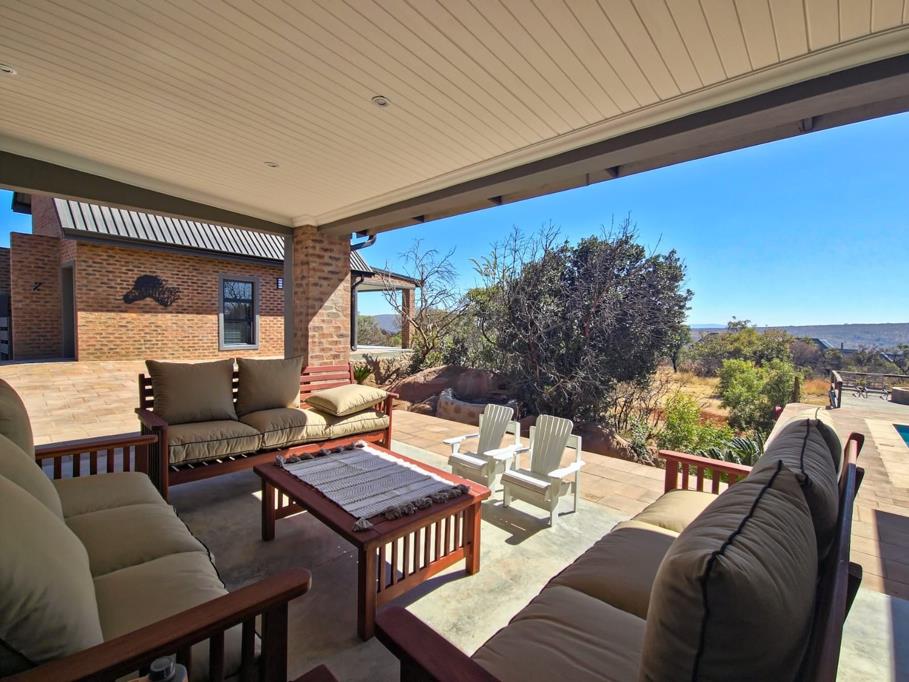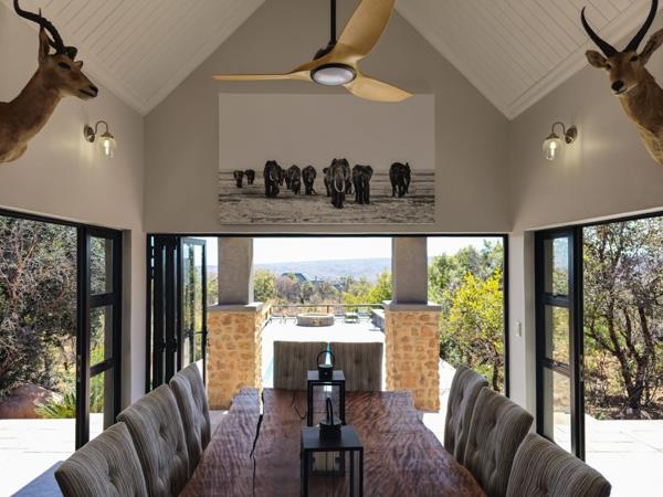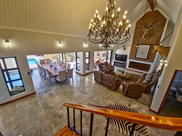 Step through the impressive entrance hall into an expansive open-plan lounge and dining area that flows seamlessly onto a covered patio, where breathtaking bushveld views, a striking lap pool and an inviting boma create the ultimate safari-living experience.