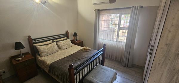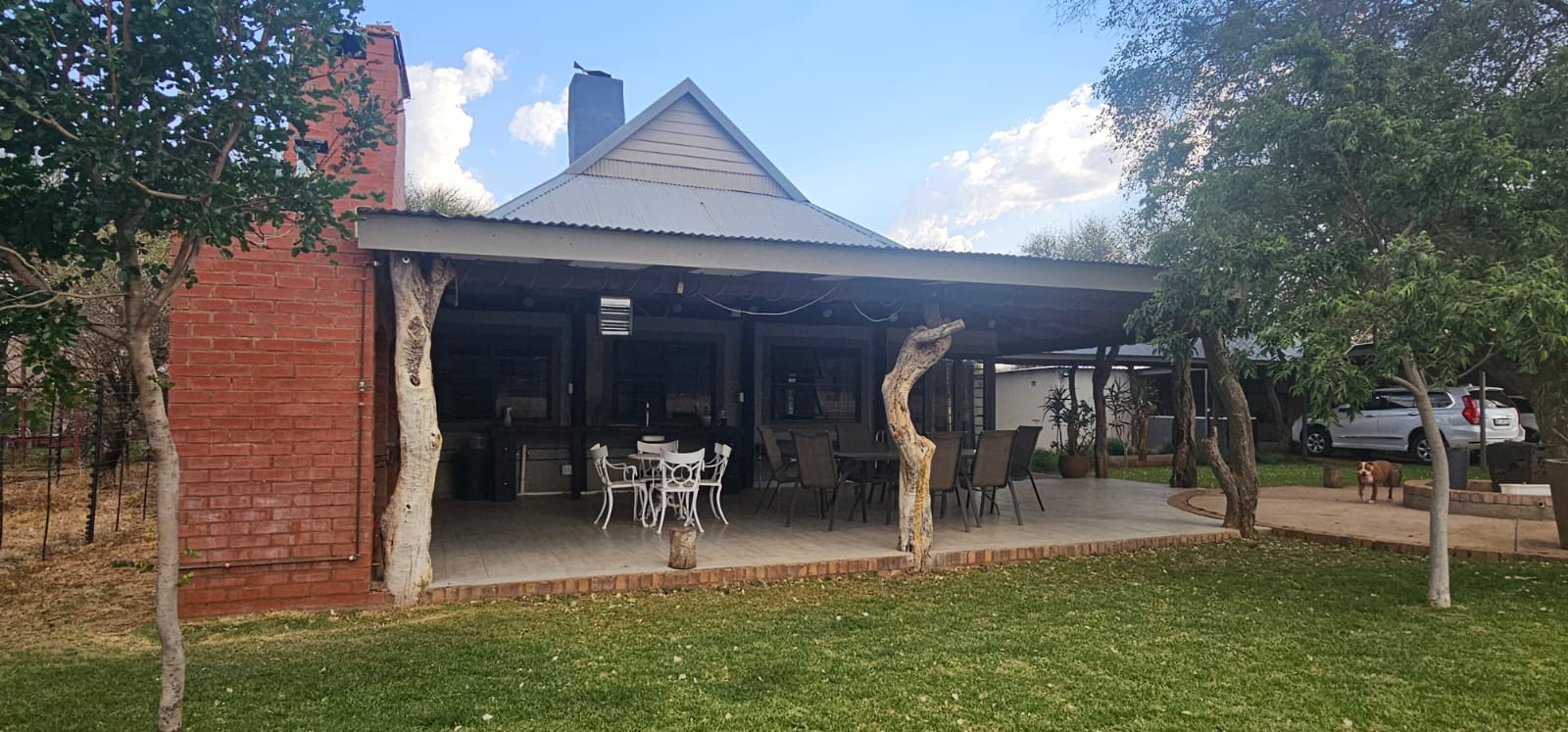 The main residence features 3 bedrooms, 2 bathrooms, a laundry room, separate study with bathroom, and an open-plan kitchen, dining, and living area with a cozy fireplace. The covered patio boasts a built-in braai, lapa and solar lighting around the home, surrounded by a landscaped garden.