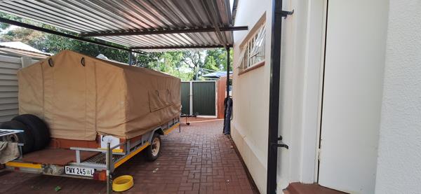 Stepping outside, the property continues to impress with a large yard that provides ample space for children to play. A double carport ensures secure parking, while an additional covered parking area is currently used for a camping trailer. The property also features a borehole, ensuring a reliable water supply. A separate bachelors flat offers the potential for rental income, guest accommodation, or even a home office. Two storerooms provide plenty of extra storage space, making it easy to keep the home organized.