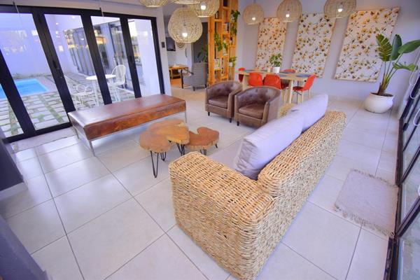 The property includes two generously sized bedrooms, each with modern ensuite bathrooms and ample built-in storage. The main suite enjoys the added bonus of opening onto a tranquil private garden, creating a perfect nook for morning coffee or quiet reflection. An additional covered patio with a built-in braai and stacking doors bridges the lush garden and pool area, creating a seamless indoor-outdoor flow throughout the home.