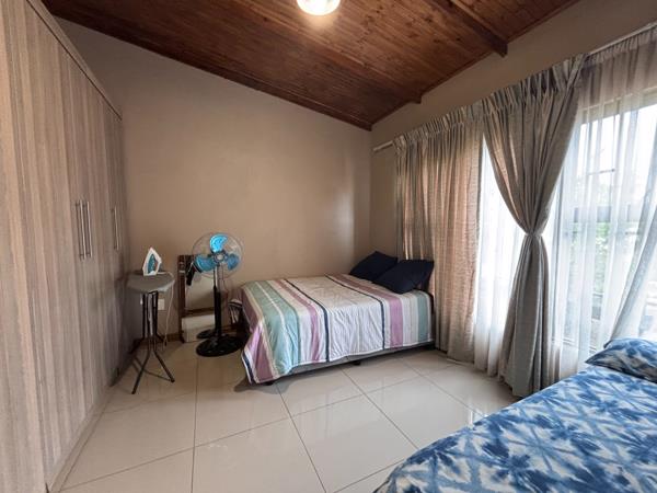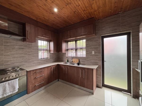 Sliding doors open from the living area to a covered patio with a built-in braai, perfect for entertaining guests or enjoying a relaxed weekend with family. The private garden area offers additional outdoor space for leisure or small pets.