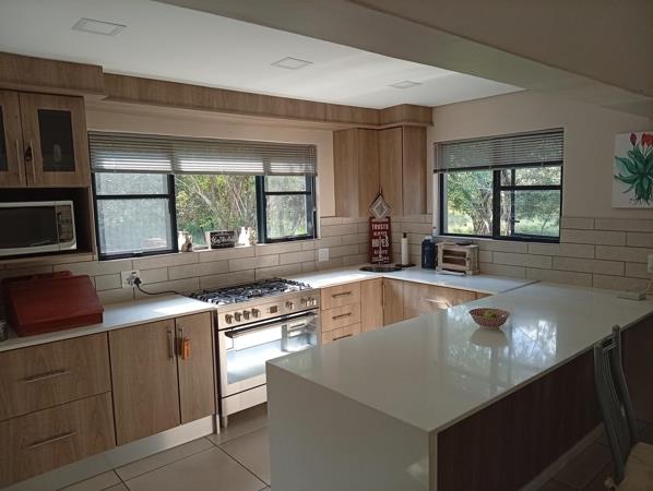 The well-designed kitchen is both attractive and functional, complemented by a separate scullery. In addition, the home offers a range of valuable extras, including an additional electric geyser, roll-up sun blinds on the veranda, two 1000-litre JoJo Slimline tanks with an electric pump harvesting water, an automated sprinkler system, fly screens on most doors and windows, two air conditioners, and a gas fireplace.