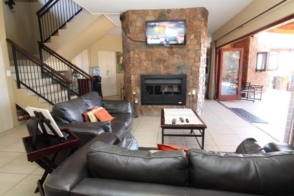 Spacious lounge with a warming fireplace, flowing through sliding-folding doors to the patio