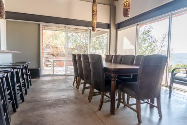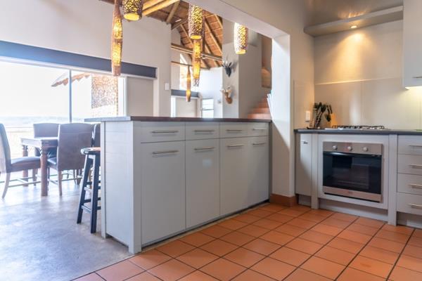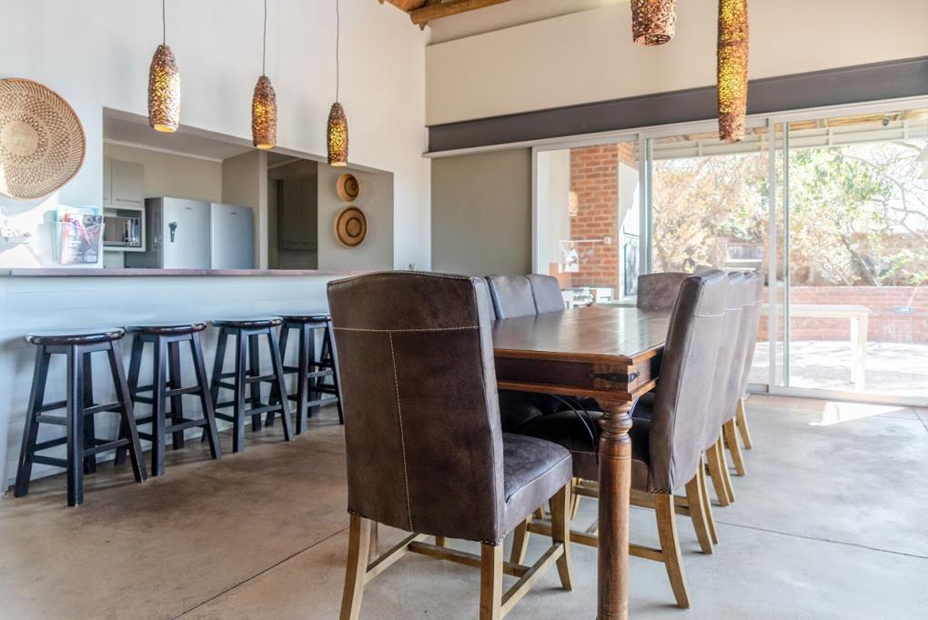 The home boasts a private swimming pool, built-in braai, and a separate, traditional-style bomaperfect for stargazing and evenings around the fire. Inside, an open-plan kitchen and dining area opens to the outdoors, seamlessly blending indoor and outdoor living. A cozy lounge with a built-in fireplace and a dedicated games room round out the entertainment offerings.