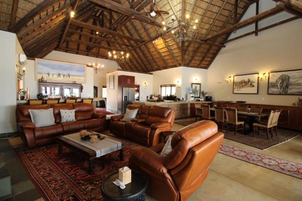 Expansive open-plan lounge and dining flow onto the enormous Rhodesian Teak deck, delivering panoramic sunset views of plains, waterhole and frequent game movement.