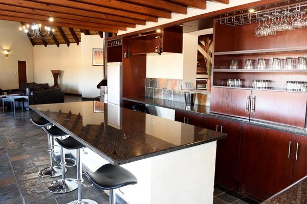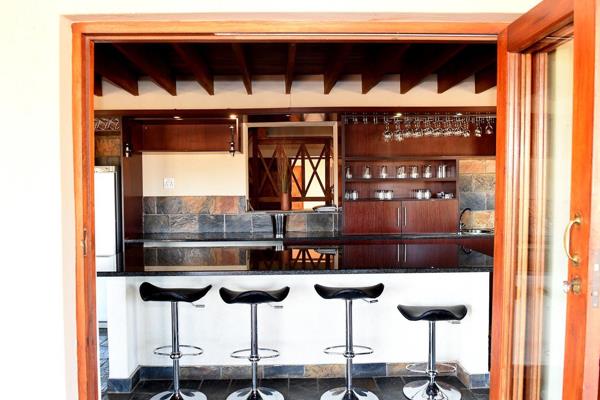 This spacious home has an open planned kitchen, lounge, dining room and bar which leads out onto a covered patio, with braai which overlooks the pool and boma area. The lounge area has an amazing fireplace that will heat up the space on those chilly winter nights