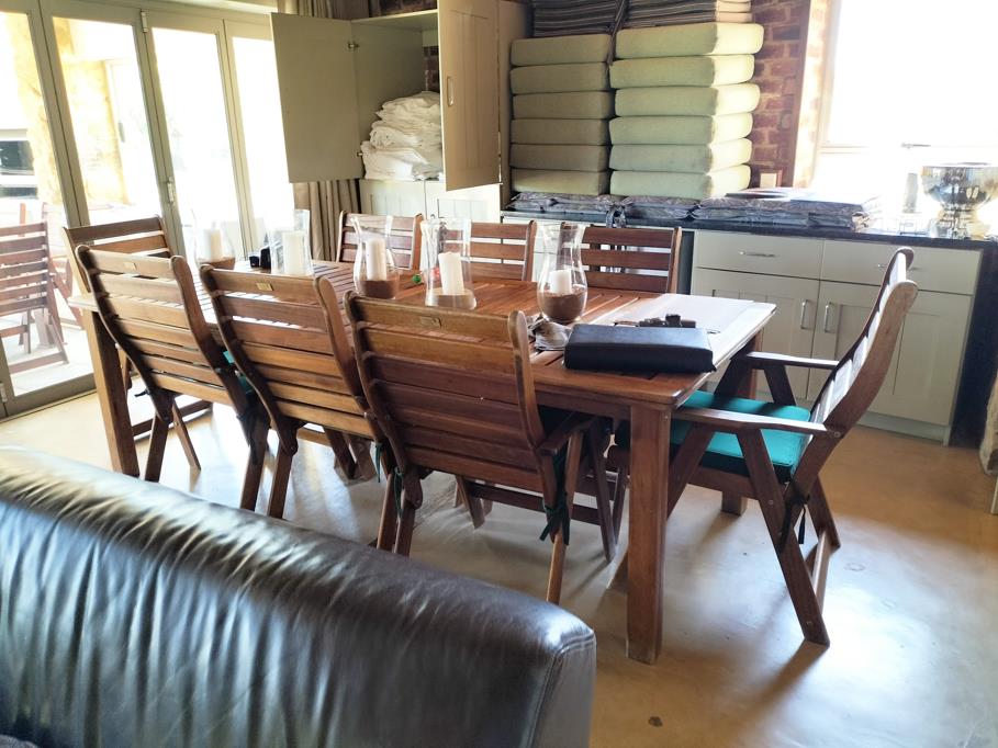 A spacious outdoor patio with a built-in braai, overlooking the swimming pool and bushveld, with a nearby bushveld boma