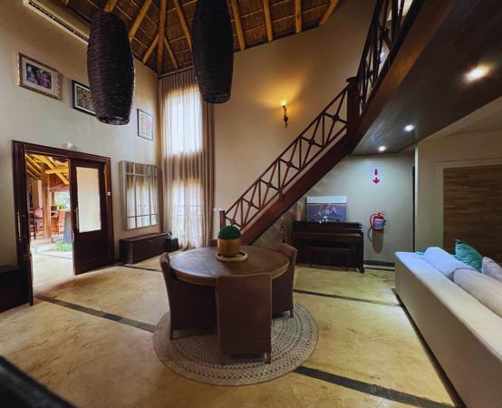 Positioned on the 18th fairway, the main house embraces the charm of thatch roofing and the comfort of modern luxury, blending beautifully with the natural environment.