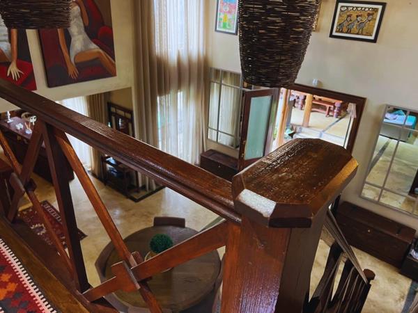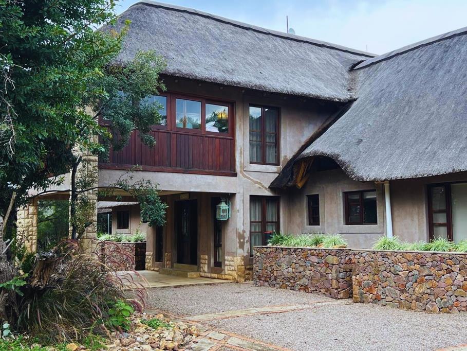 Upstairs, the main bedroom suite features a luxurious en-suite bathroom and access to a private covered patio with sweeping bushveld views