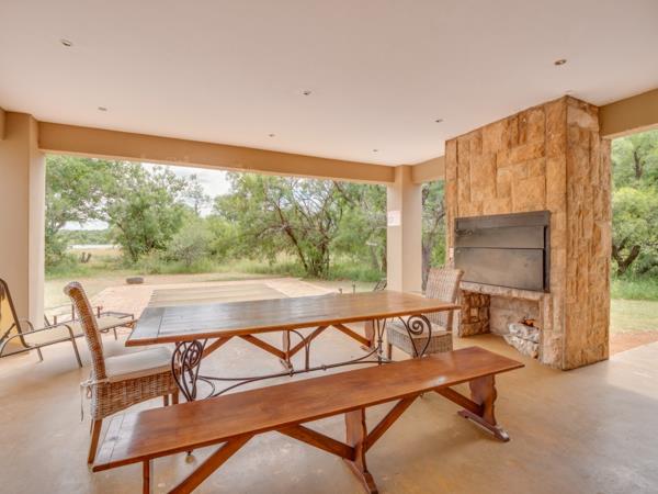 This spacious home has an open planned kitchen, lounge, dining room which leads out onto a covered patio, with braai which overlooks the pool and boma area and a gorgeous view on the Zebula Dam. The lounge area has an amazing fireplace that will heat up the space on those chilly winter nights