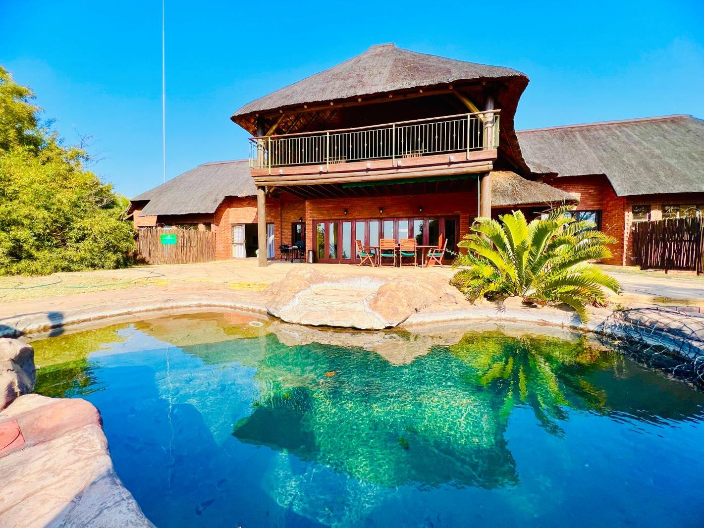 This stunning house is based on the green belt that offers views of the bush and the dam, giving this property the tranquility that makes it a true oasis. It offers 4 large bedrooms each with its own en-suite bathroom. Bathrooms each boast a bath and shower, and two of the bathrooms have outdoor showers too. The bedrooms are very private and features the same views with north-facing windows for those colder winter days. The central living room and dining room is spacious yet cozy with a lovely indoor fireplace. But the patio with bar and rock pool give that true bushveld holiday feeling!