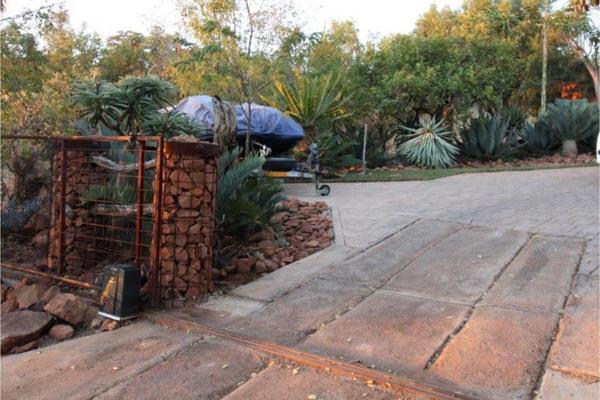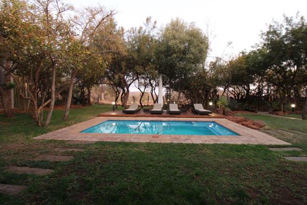 This is the ideal family home with interesting facilities for teenagers and adults. Heated pool with a wooden deck and beautiful loungers to relax in the sun. Five bedrooms (including the bachelor flat) all with en-suite bathrooms. Open plan kitchen, dining room, lounge, and TV room. Study and guest toilet. Living rooms and bathrooms recently re-furbished with vinyl wood flooring. Large bachelor flat with en-suite bathroom. Three garages with one extra high door for caravan or game viewer and drive through carport. Cricket pitch for youngsters and adults to practice. Spectacular views over the Zwartkloof mountains and bushveld with breath-taking sunset views from the boma areas. Large open plan living with TV Room, lounge, dining room and spacious kitchen with underfloor heating. The open plan leads onto the large patio and pool room with drop down canvas for winter or rainy days. Two boma areas with pizza oven and very large Jacuzzi.