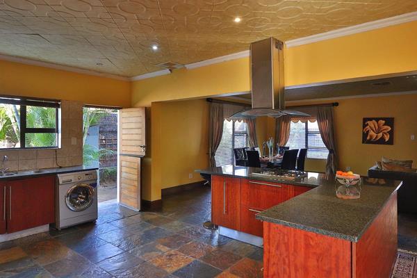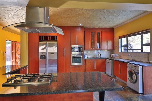 A well designed open plan kitchen with Caesarstone tops and matching appliances, forms part of the living areas and flows through to the braai room.