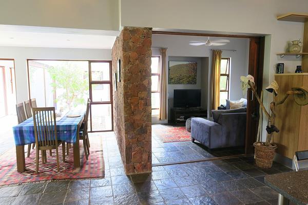 The main bedroom is a sanctuary, offering an en-suite bathroom complete with 2 basins, a bath, and both inside and outside showers. As you wander through the property, the allure of the private nature reserve unfolds, managed to preserve its natural beauty.